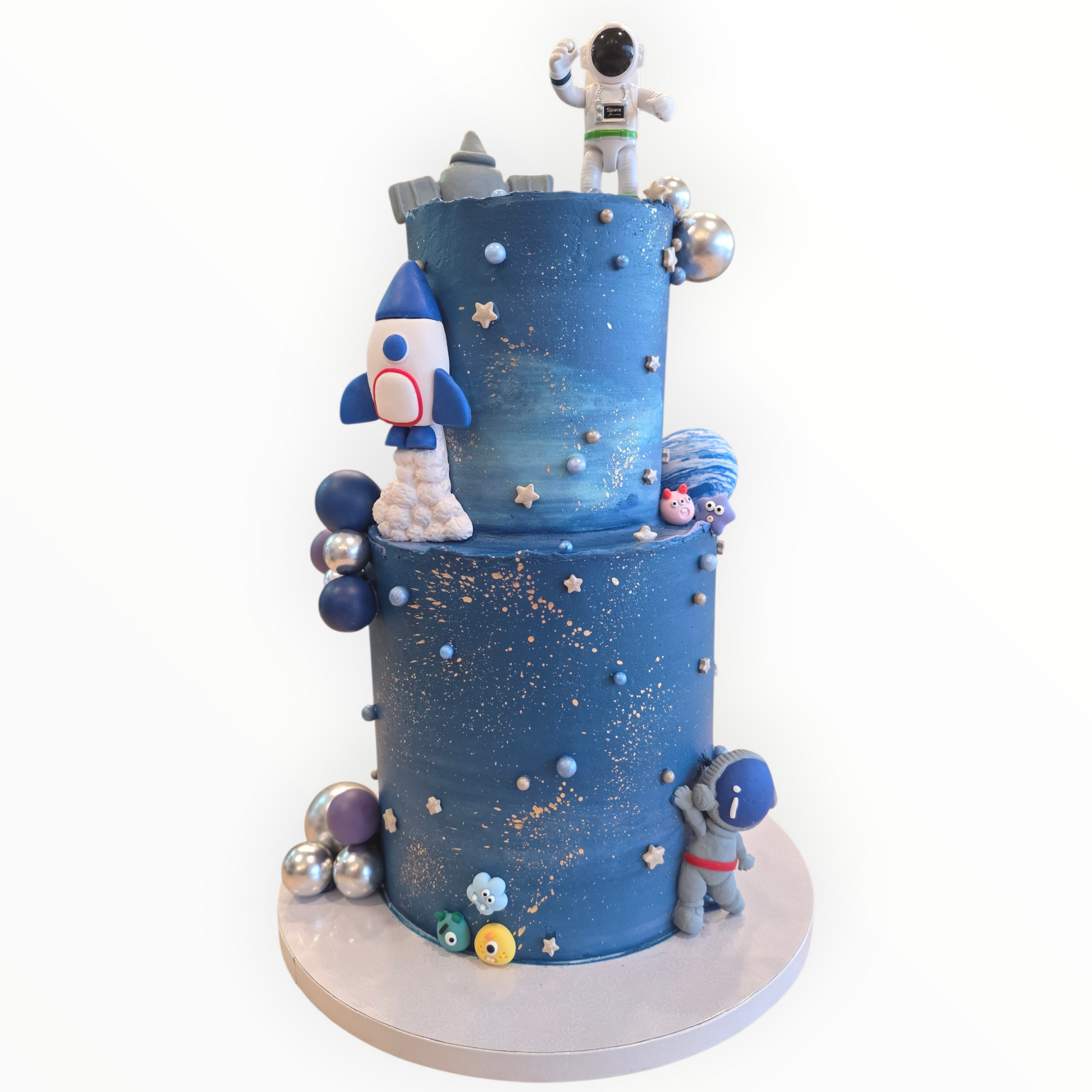 Blast off into sweetness! 🚀✨ This astronaut-themed cake is decorated with stars, planets, and a tiny edible astronaut, bringing the wonders of space to your celebration. Perfect for space lovers, birthdays, or anyone ready for a cosmic adventure!