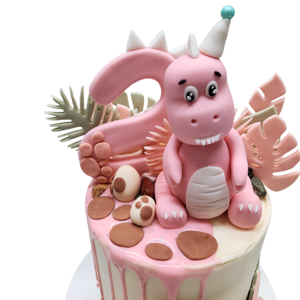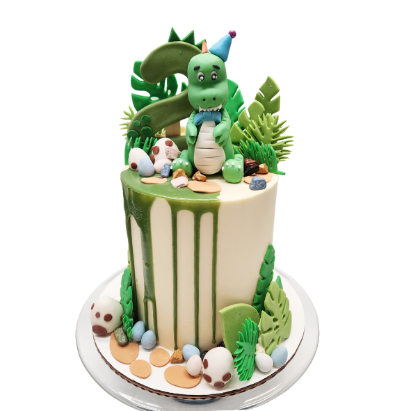 Bring the dino back to life with this super cute cake! Buttercream finished with fondant accents of baby dino sculpture, giant leaves, dino eggs, and fondant number sign