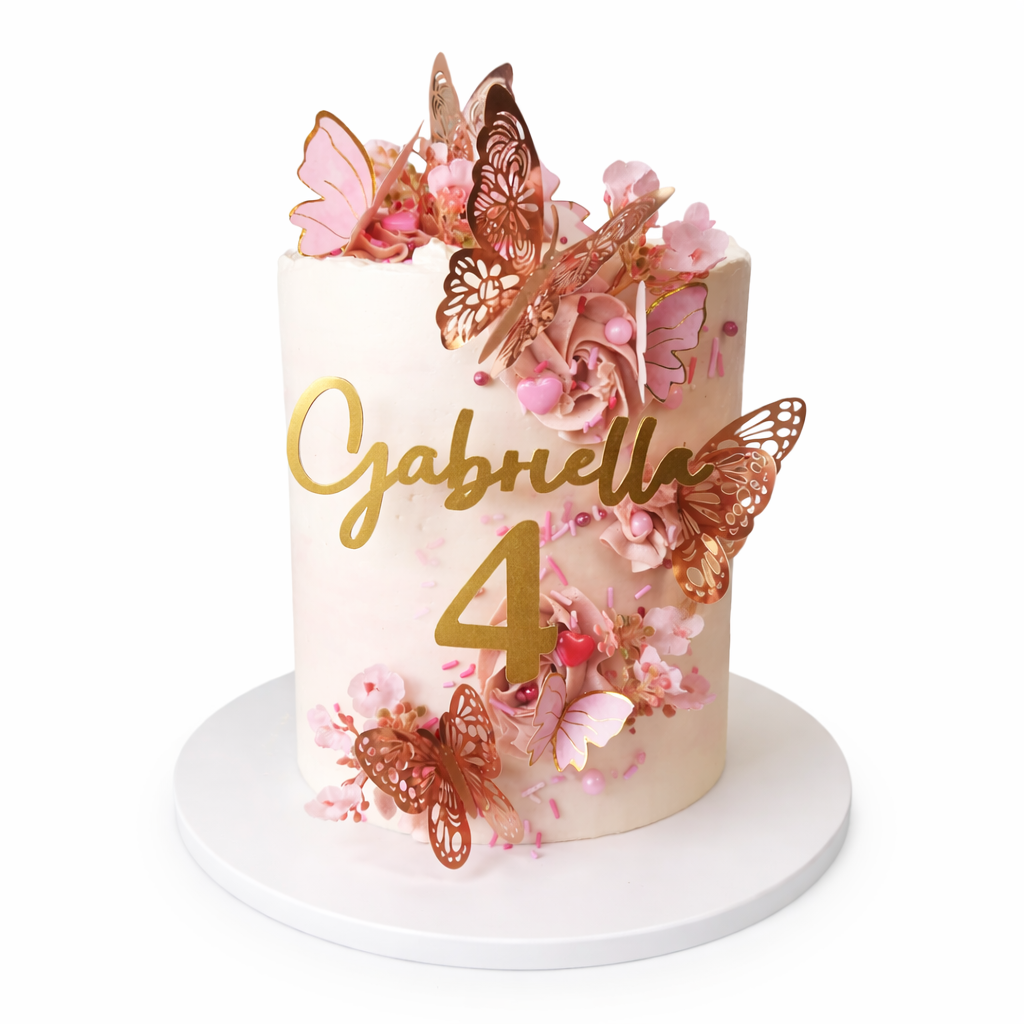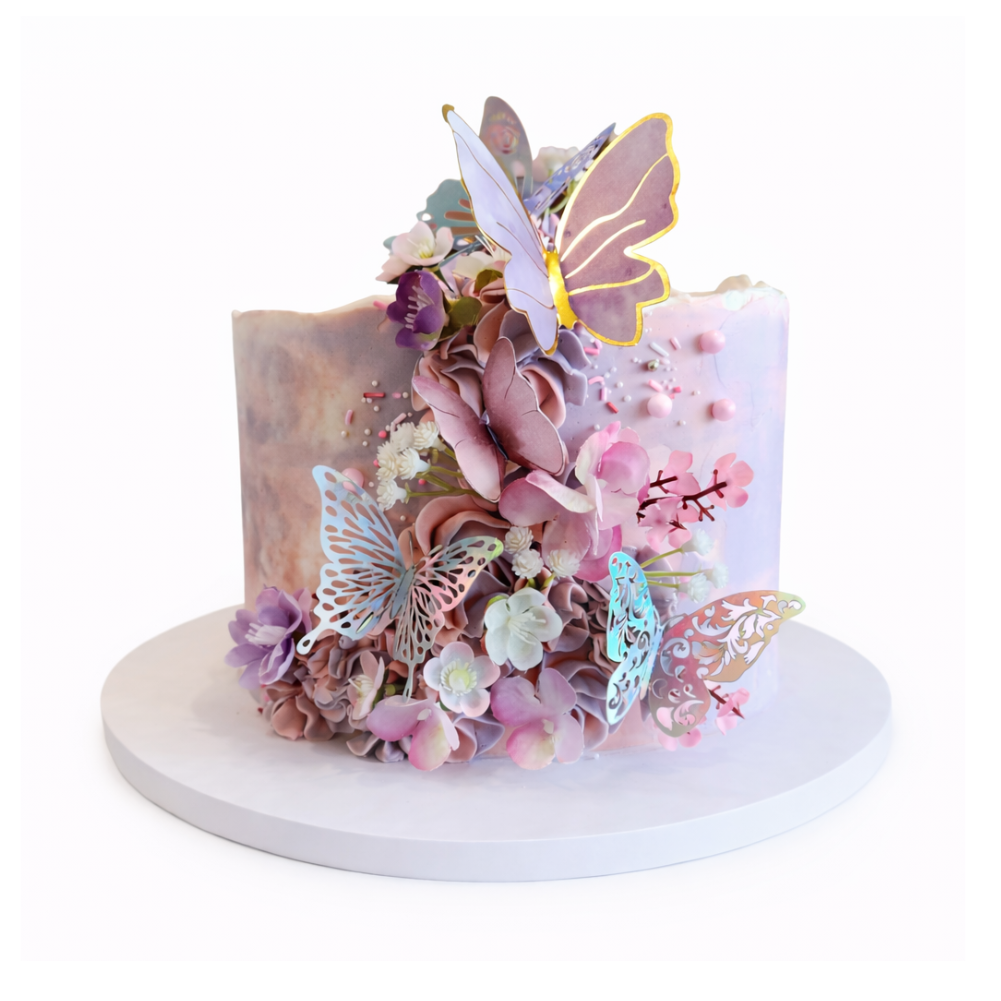 Whimsical, colorful feel, perfectly capturing the charm of butterflies, sprinkles, and delicate buttercream rosettes.