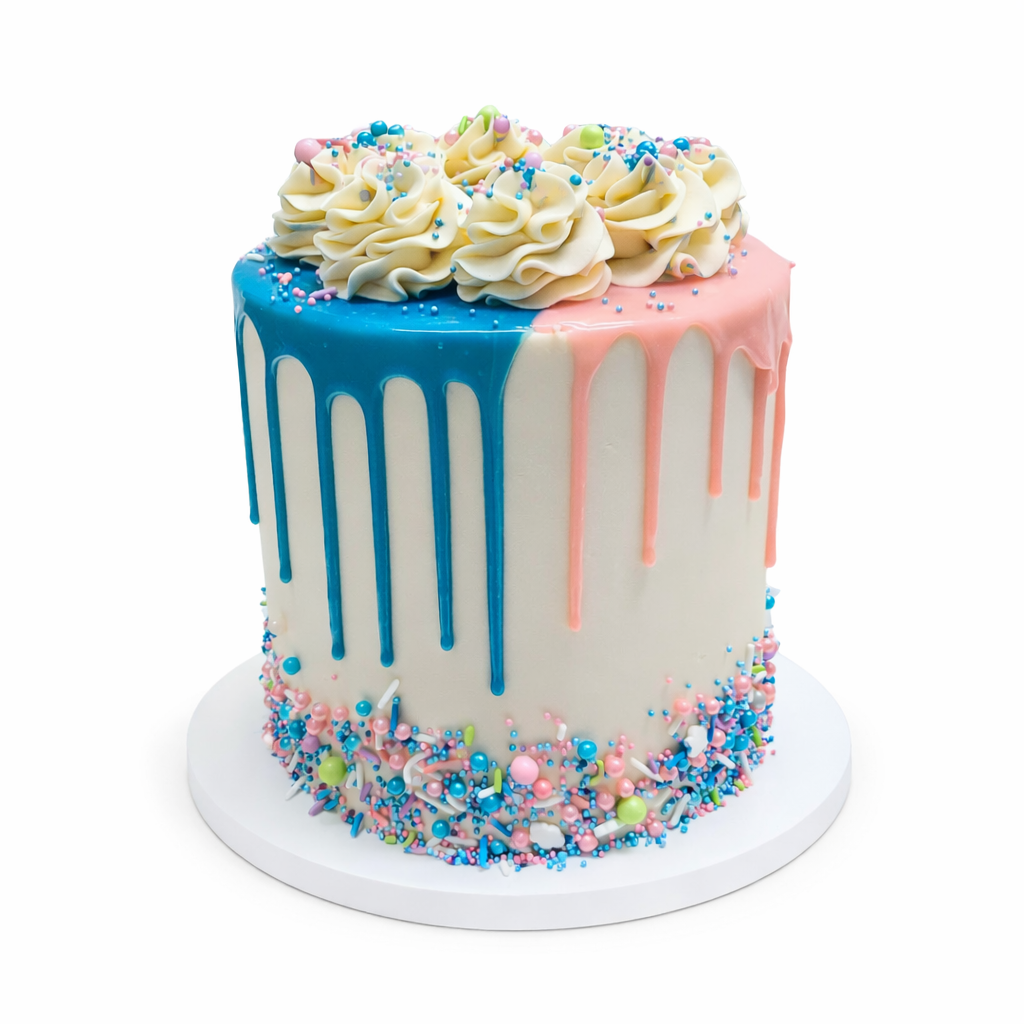 A smooth white cake finished with pink and blue chocolate drips, hiding the sweetest surprise inside