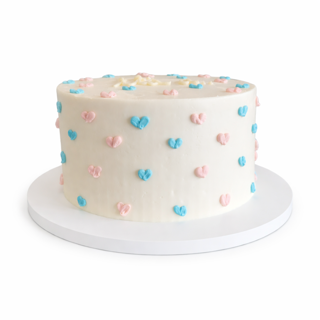 Buttercream finished cake with fine detailing of pink and blue buttercream hearts