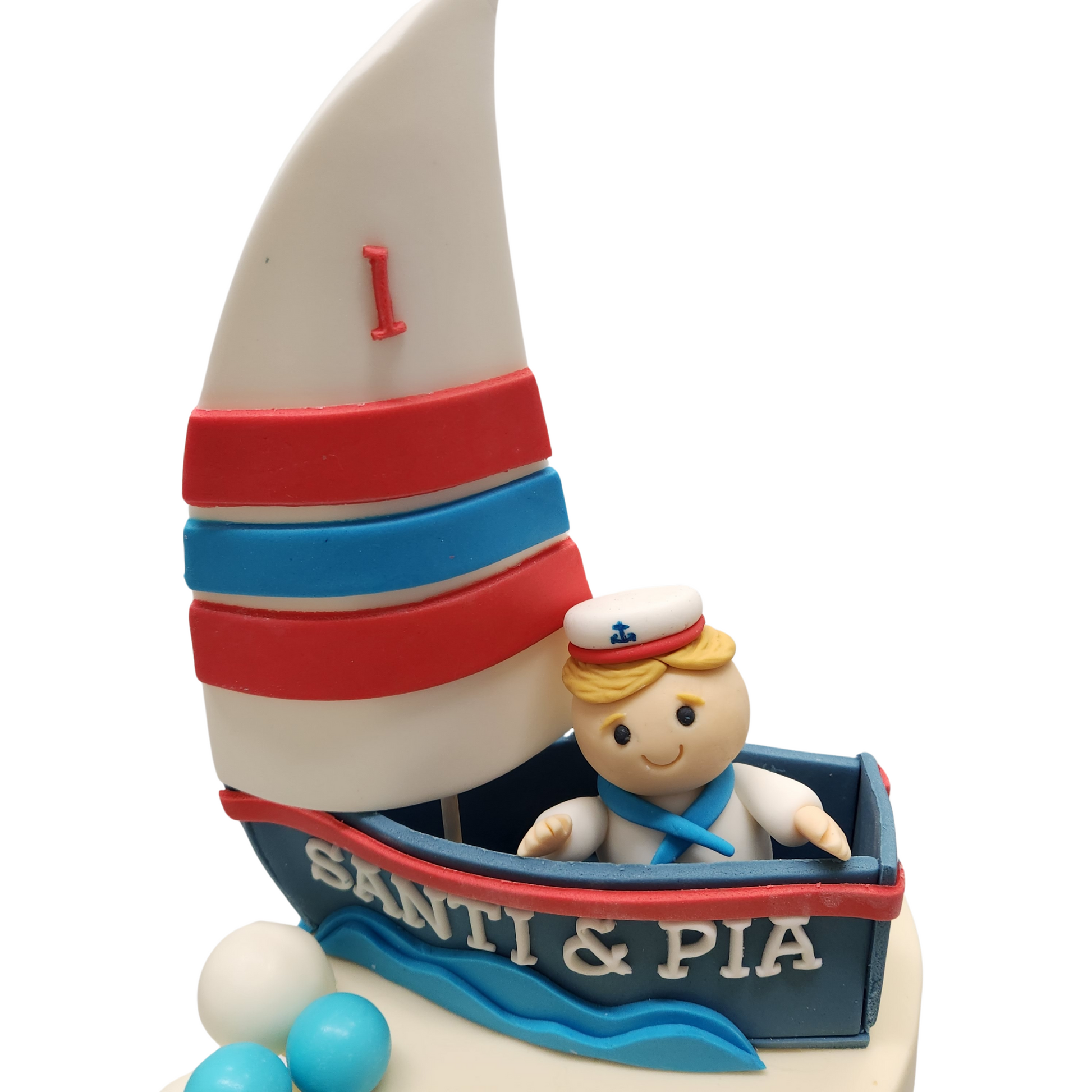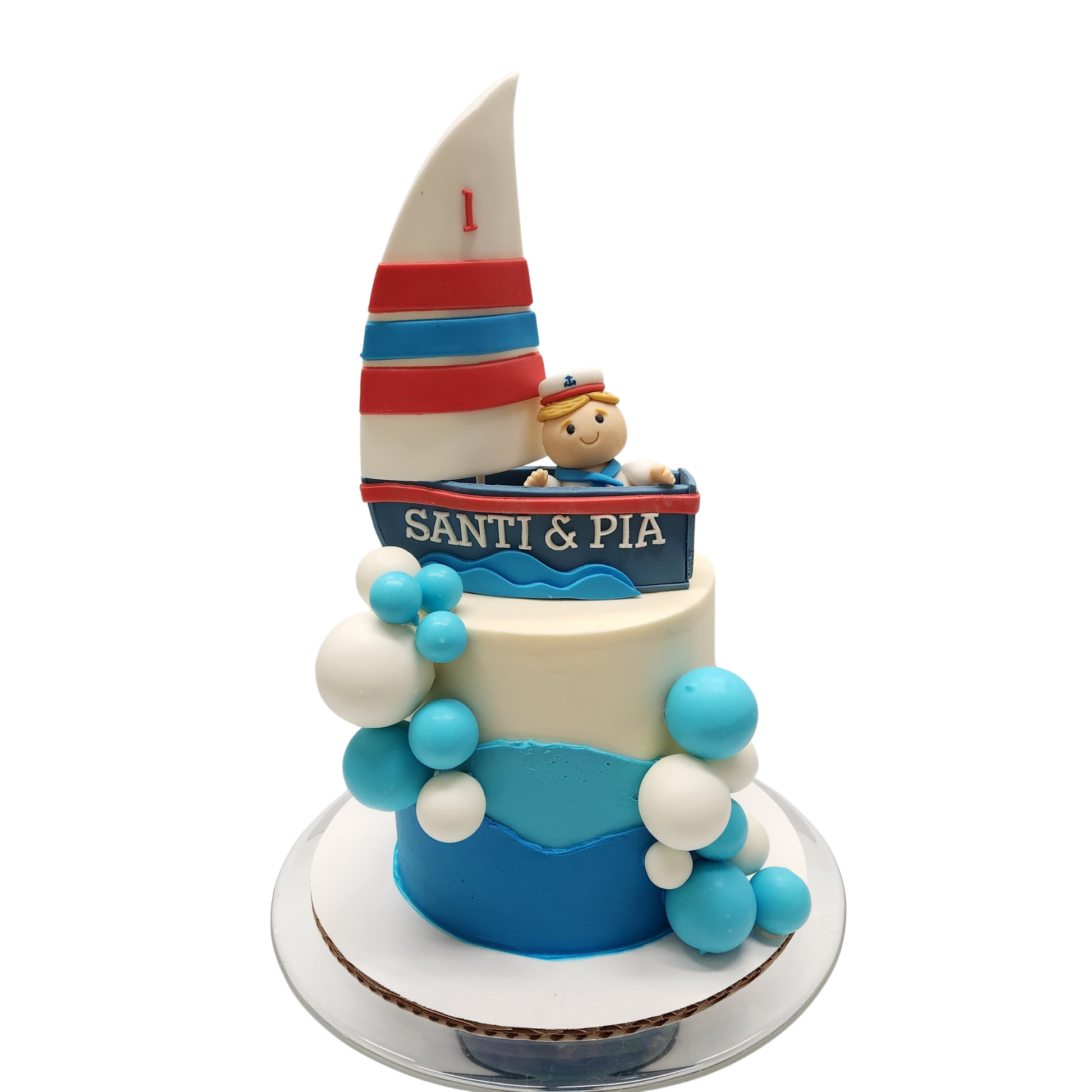 A charming buttercream cake featuring gentle waves and ocean blues, topped with a fondant sailing boat and an adventurous young sailor. Perfect for little captains setting sail on their special day!