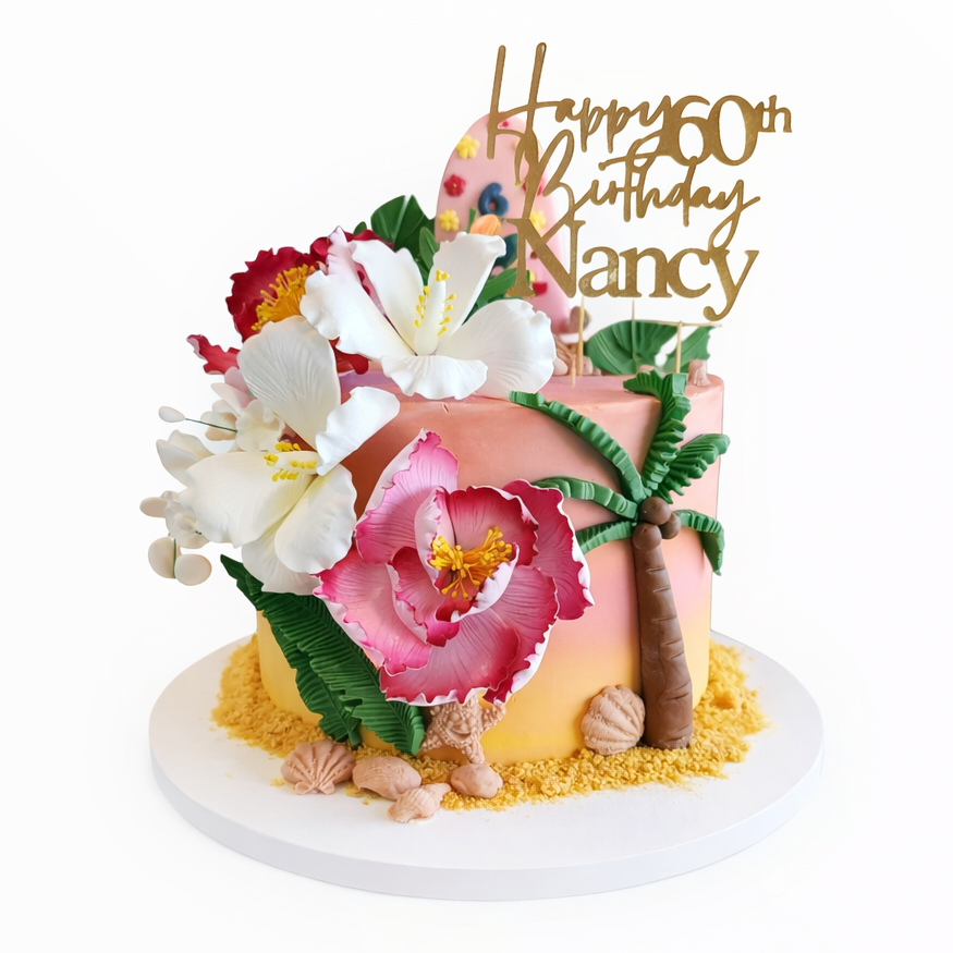 Say aloha to paradise! Aloha Sunset brings island vibes to your celebration with sunset-toned buttercream, fondant surfboards, tropical flowers and tree, sugary sand, and seashells. Perfect for beachy birthdays, summer parties, or luau-inspired fun.
