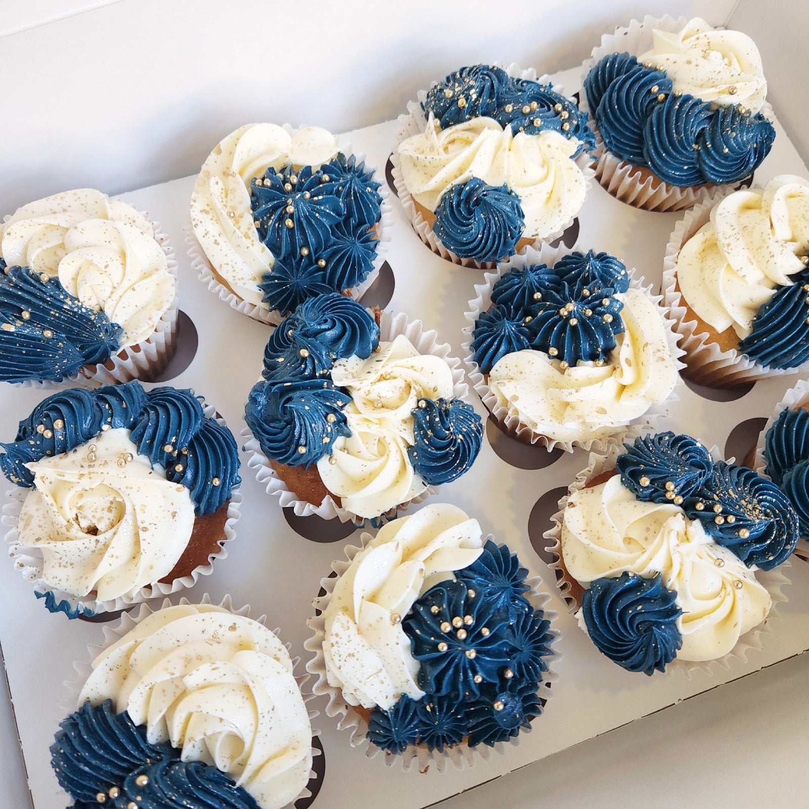 Midnight blue and white buttercream with gold pearls and sparkles