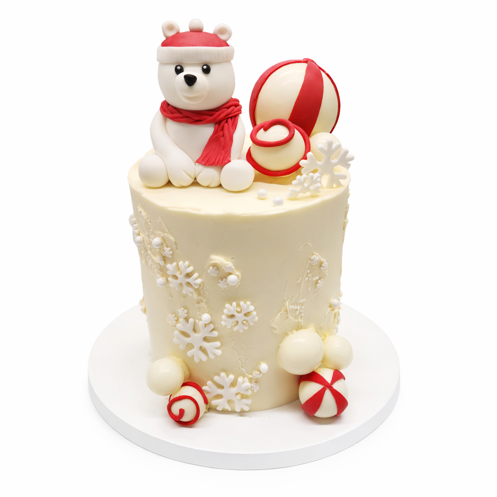 Buttercream finished with cute winter accents, a fondant polar bear, and chocolate spheres