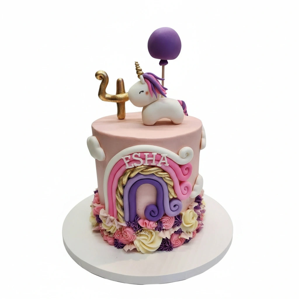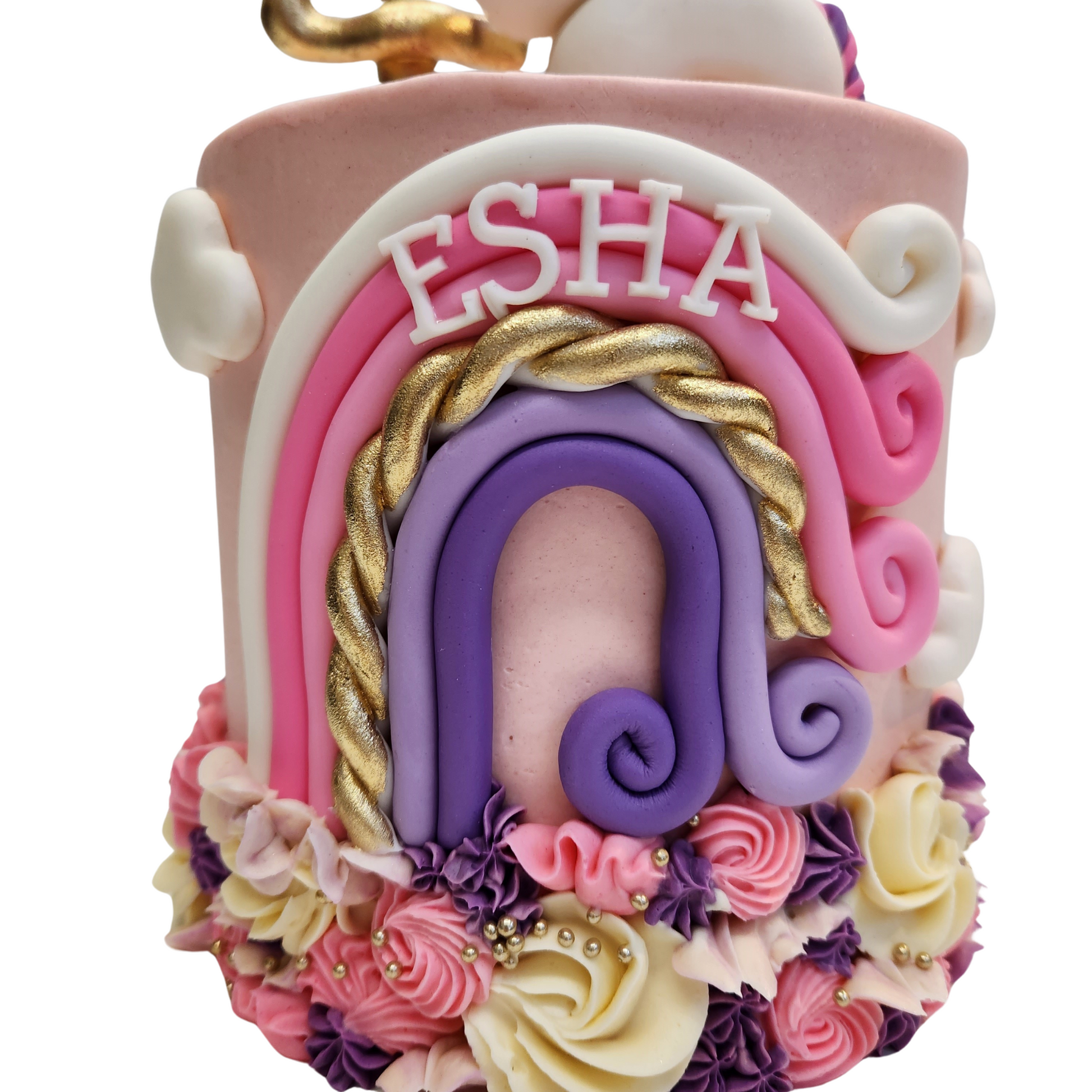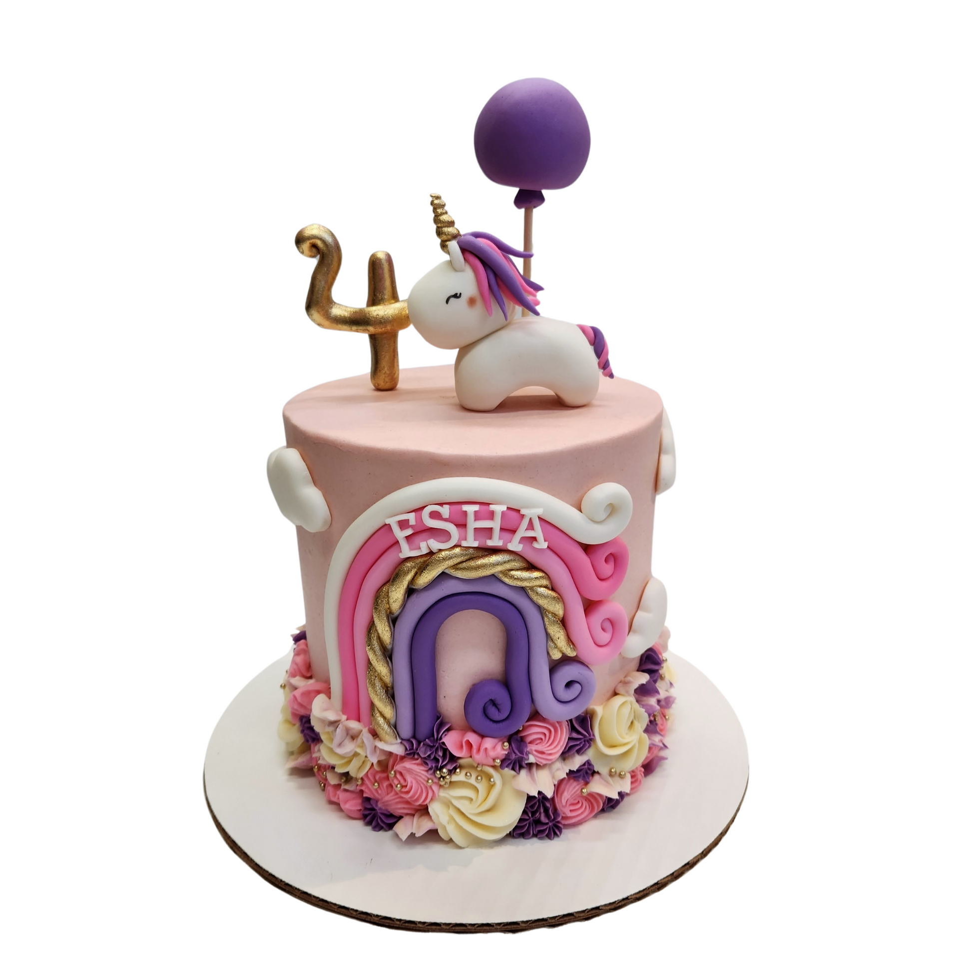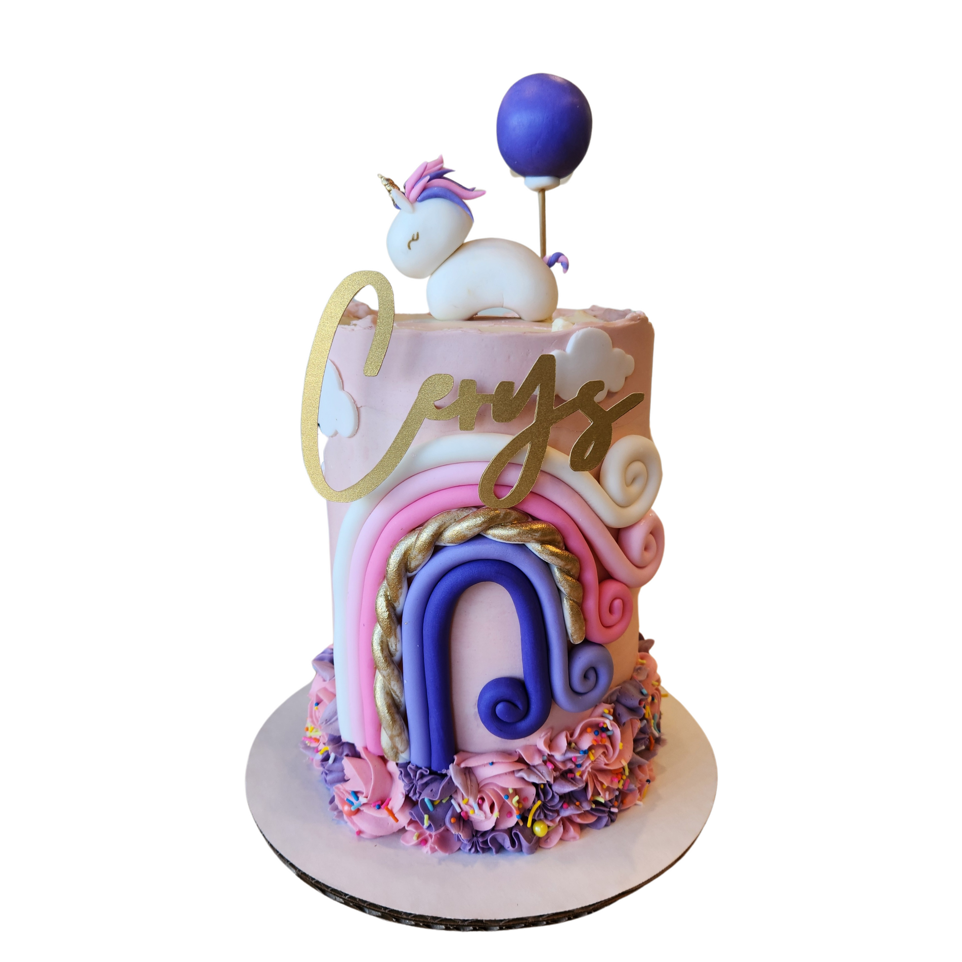 Buttercream finished cake with colorful rainbow, fondant unicorn, different textures of piped buttercream base.