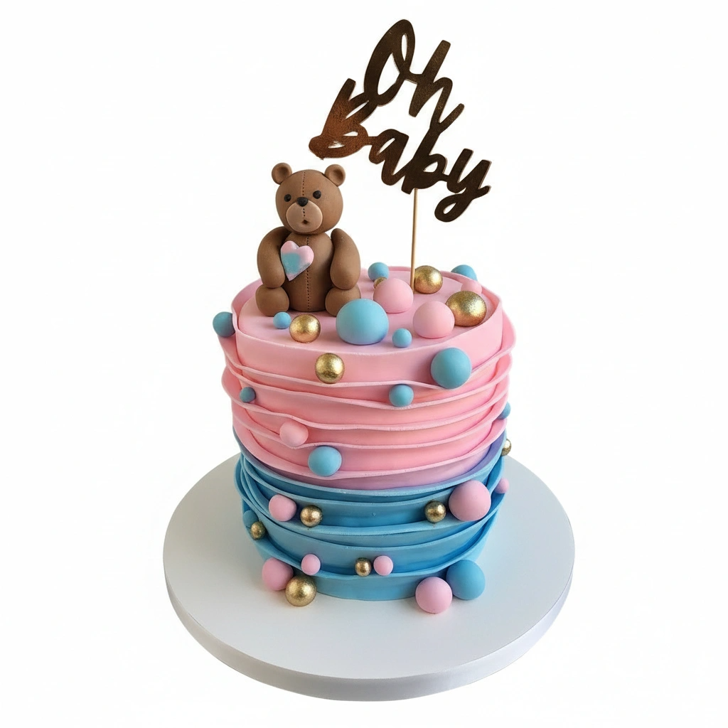 Wrap your celebration in warmth and sweetness with Snuggle Bear — a cake adorned with pink and blue fondant ruffles and a cuddly teddy bear topper. Perfect for baby showers or gender reveals, this cake is a huggable treat that makes every moment even more special.