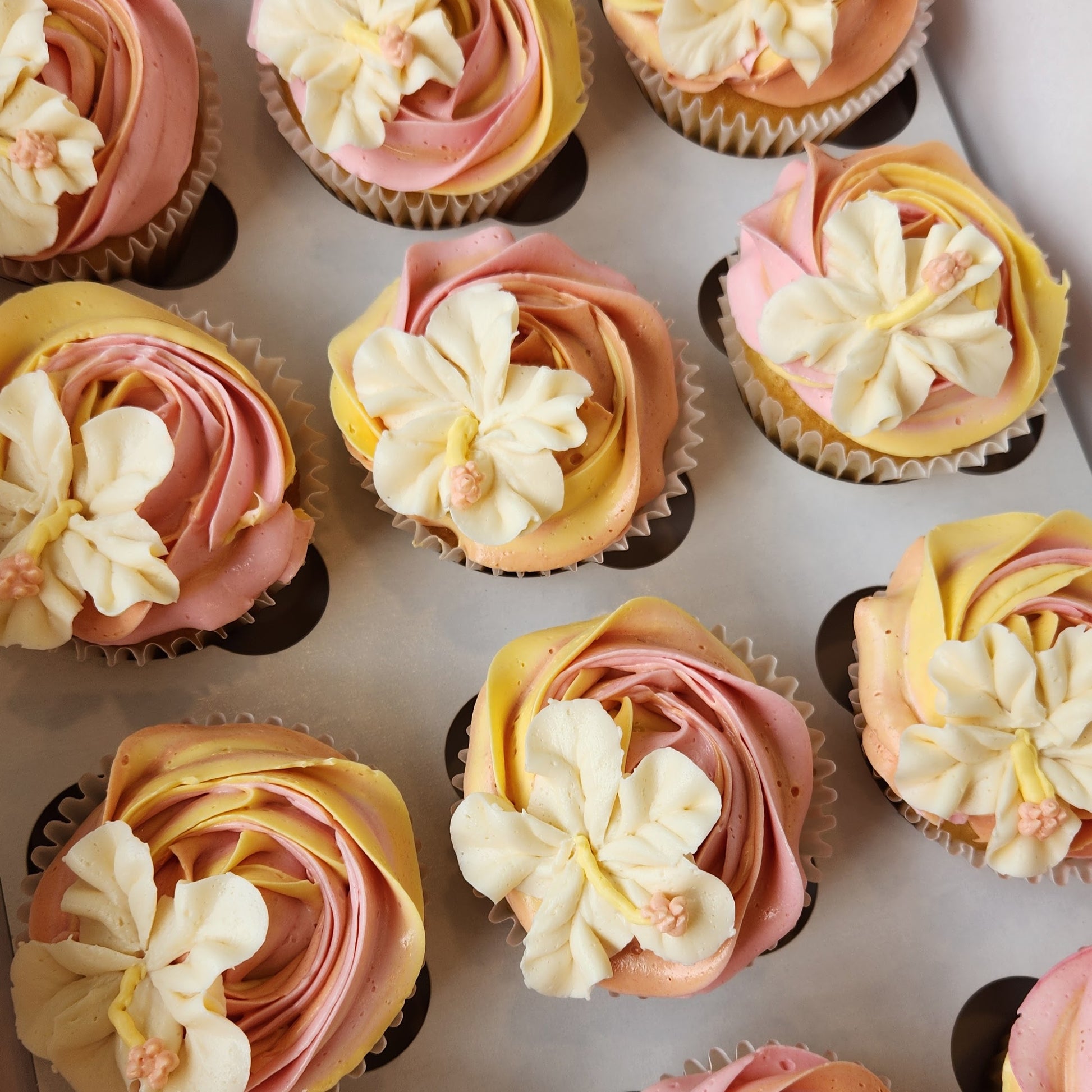 A taste of paradise in every swirl. Sunset Luau features sunset-hued icing that captures the warmth of golden hour, topped with a delicate hibiscus buttercream that adds a floral, tropical twist. Inspired by Hawaiian evenings and breezy beachside moments, this cupcake is pure vacation vibes — no passport required.