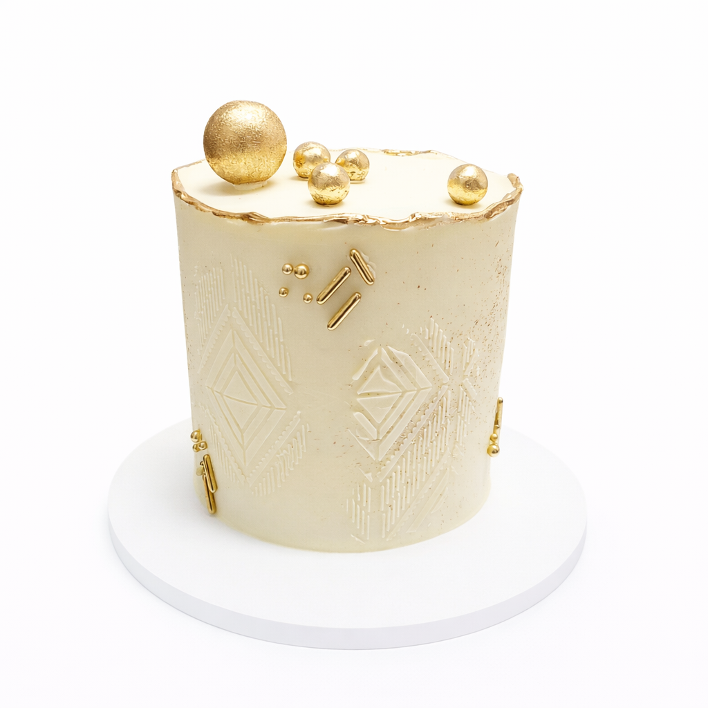 Intricately textured buttercream cake with white chocolate spheres, edible gold paint, and metallic gold sprinkles