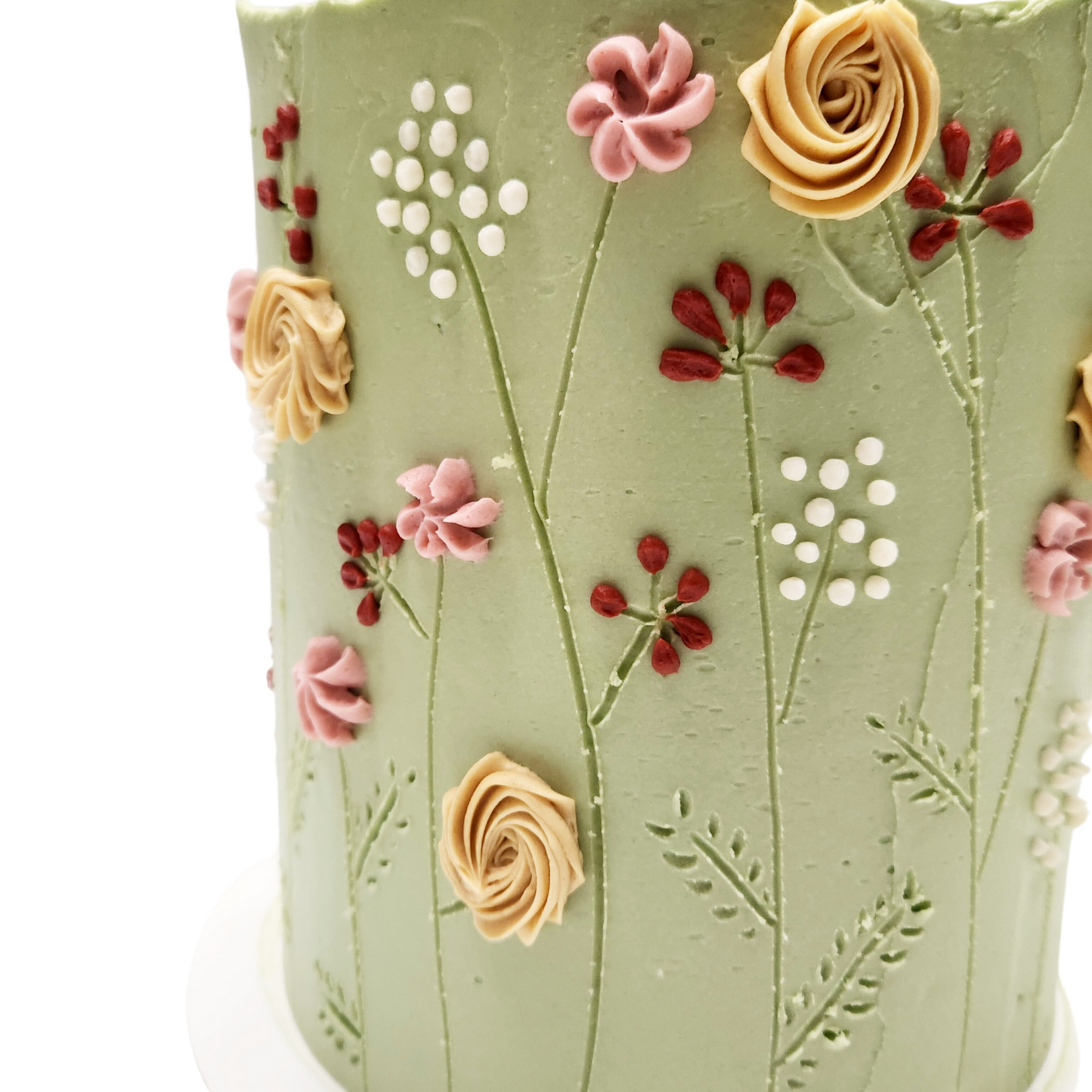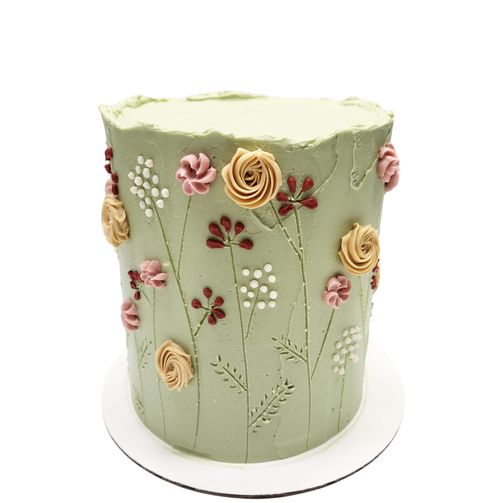 Tall, skinny tiered cake that has modern vibe! Serves atleast 18 but can feed more