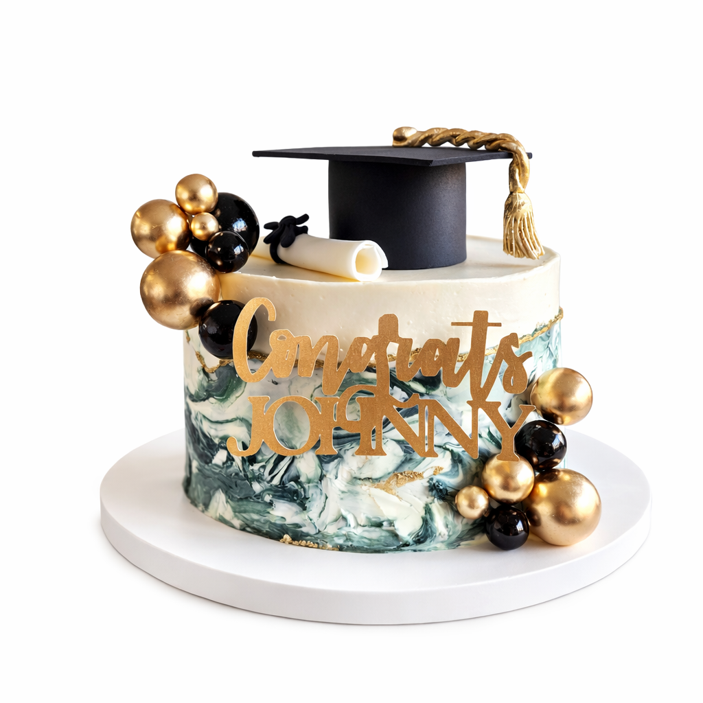 A modern graduation statement cake featuring rich marble detailing in deep green and ivory, luxe gold accents, and a classic cap-and-diploma topper.
