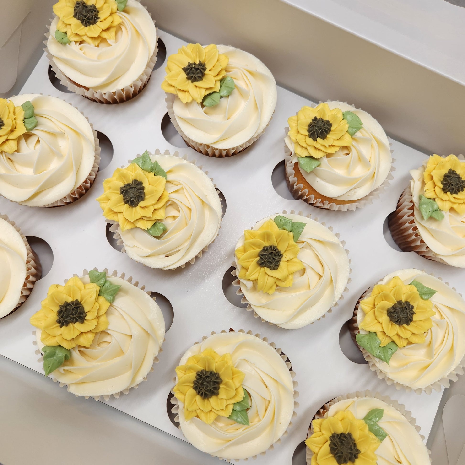 Hand piped sunflower buttercream sitting on top of a buttercream rosette